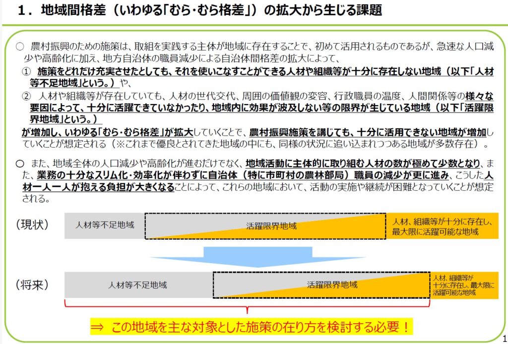 【農水省の政策提言】急速な人口減少や高齢化に加え、地方自治体の職員減少による自治体間格差の拡大によって、①施策をどれだけ充実させたとしても、それを使いこなすことができる人材や組織等が十分に存在しない地域(人材等不足地域)や、②人材や組織等が存在していても、人材の世代交代、周囲の価値観の変容、行政職員の温度、人間関係等の様々な要因によって、十分に活躍できていなかったり、地域内に効果が波及しない等の限界が生じている地域(活躍限界地域)が増加し、いわゆる「むら・むら格差」が拡大していくことで、農村振興施策を講じても、十分に活用できない地域が増加していくことが想定される。また、地域全体の人口減少や高齢化が進むだけでなく、地域活動に主体的に取り組む人材の数が極めて少数となり、また、業務の十分なスリム化・効率化が伴わずに自治体職員の減少が更に進み、こうした人材一人一人が抱える負担が大きくなることによって、これらの地域において、活動の実施や継続が困難となっていくことが想定される。農村政策の新たな動きとして、収益性に加えて、社会課題の解決を重視し、農山漁村で活動する外部の企業等が現れ始める中、農林水産省は外部の企業等の活用を重視するよう変化してきており、「人材等不足地域」や「活躍限界地域」にも、こうした施策の効果を波及させていくことが重要である。